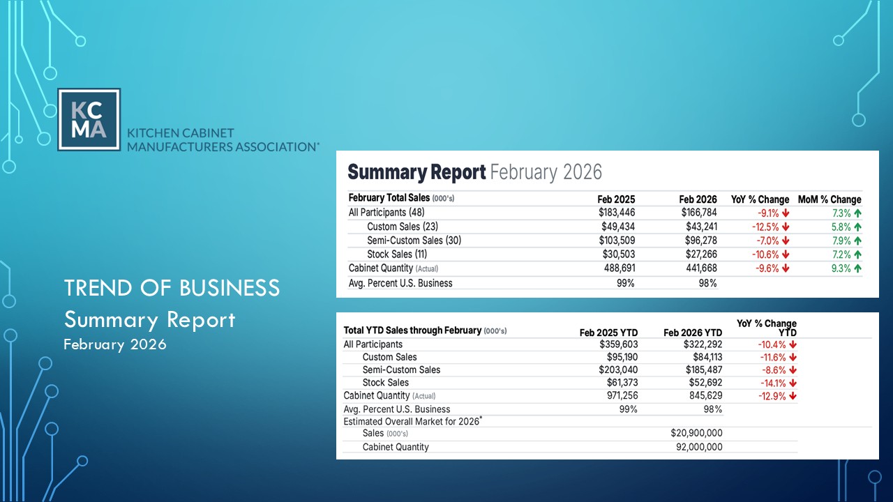 February 2026 Trend of Business Report Published on March 26, 2026 Image Cabinet manufacturers reported overall cabinet sales of were down 9.1% for February 2026 compared to the same month in 2025. Image