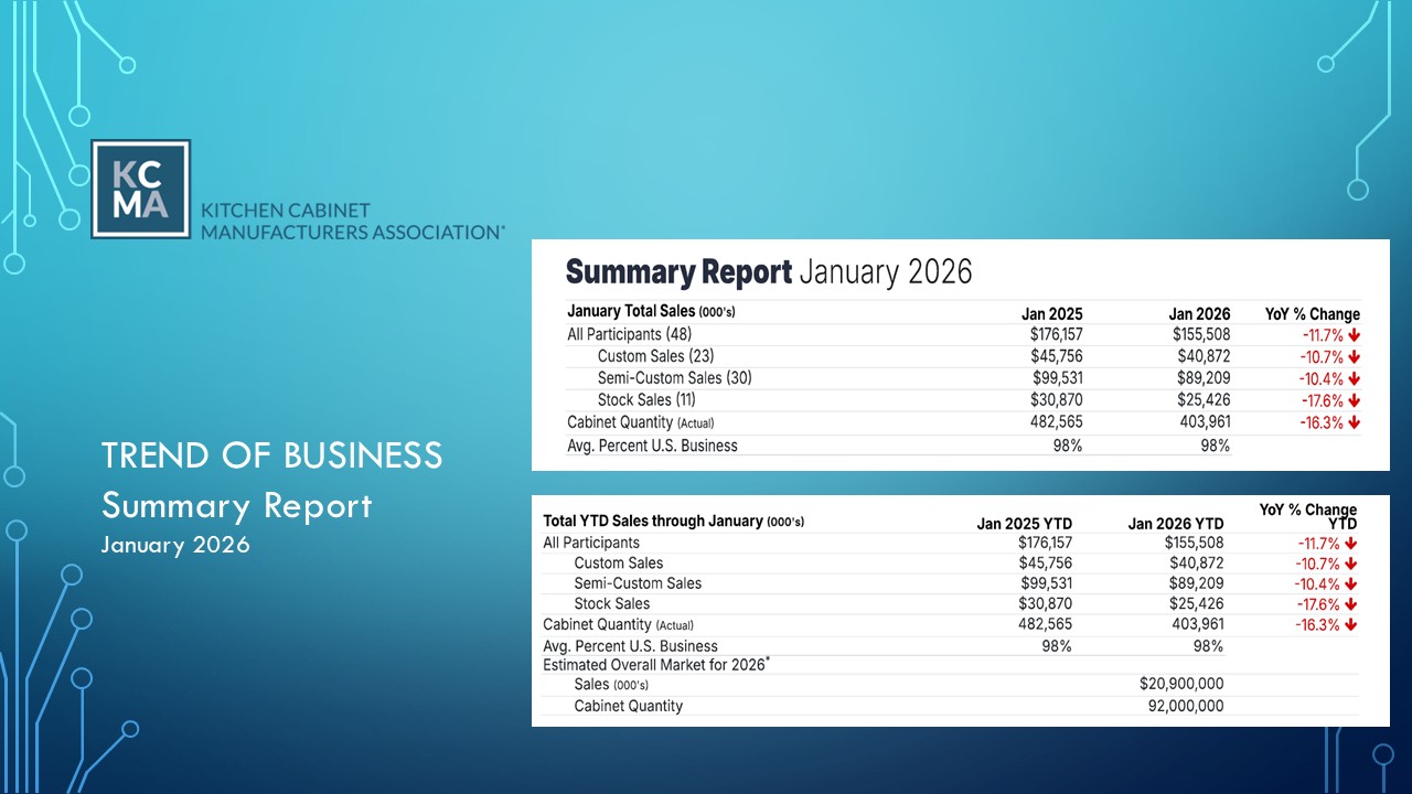 January 2026 Trend of Business Report Published on March 13, 2026 Image Cabinet manufacturers reported overall cabinet sales of were down 11.7% for January 2026 compared to the same month in 2025. Image
