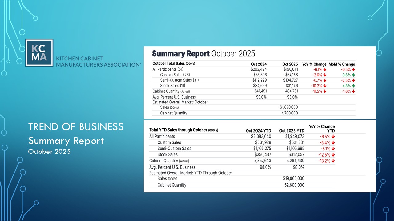 October 2025 Trend of Business Report Published on November 26, 2025 Image Cabinet manufacturers reported overall cabinet sales of were down 6.1% for October 2025 compared to the same month in 2024. Image