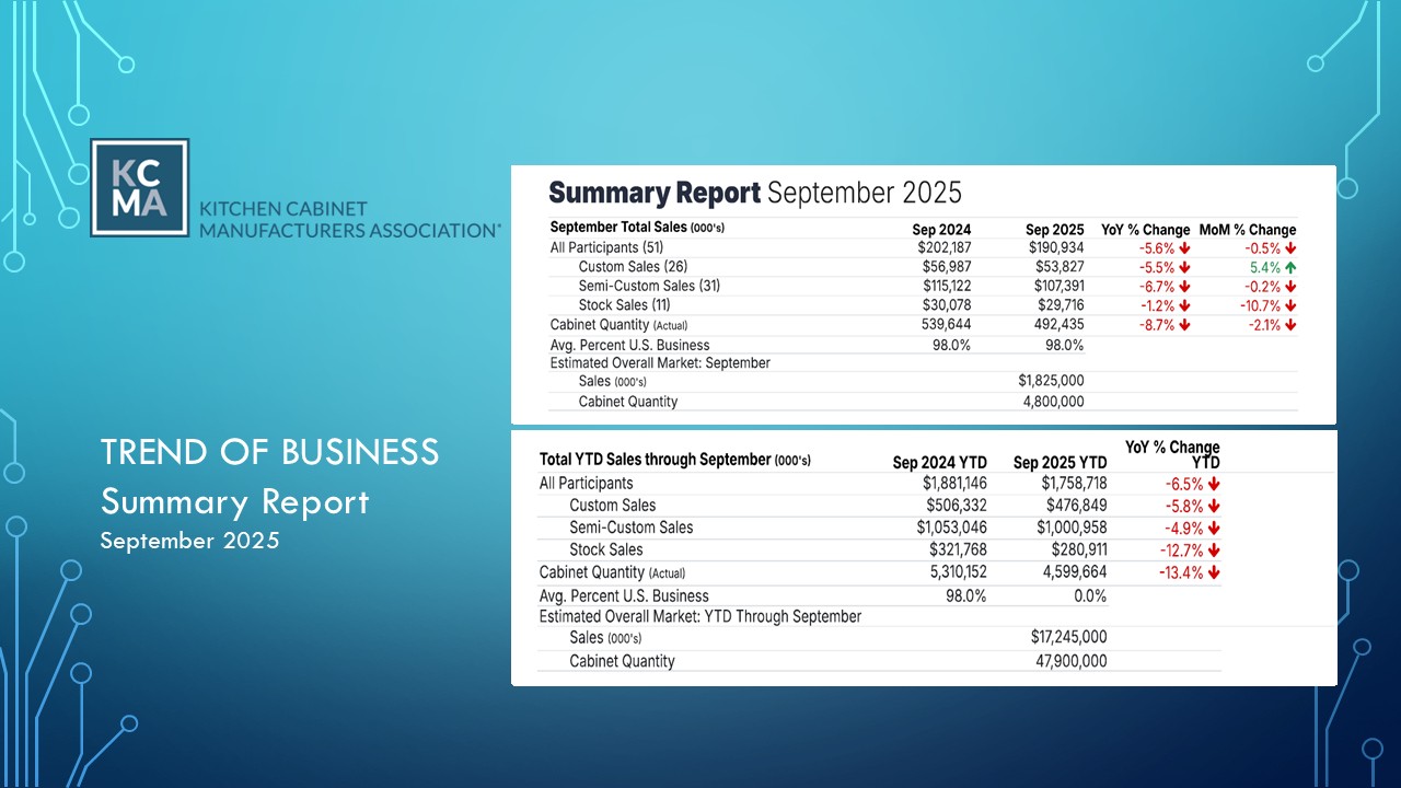 September 2025 Trend of Business Report Published on October 24, 2025 Image Cabinet manufacturers reported overall cabinet sales of were down 5.6% for September 2025 compared to the same month in 2024. Image